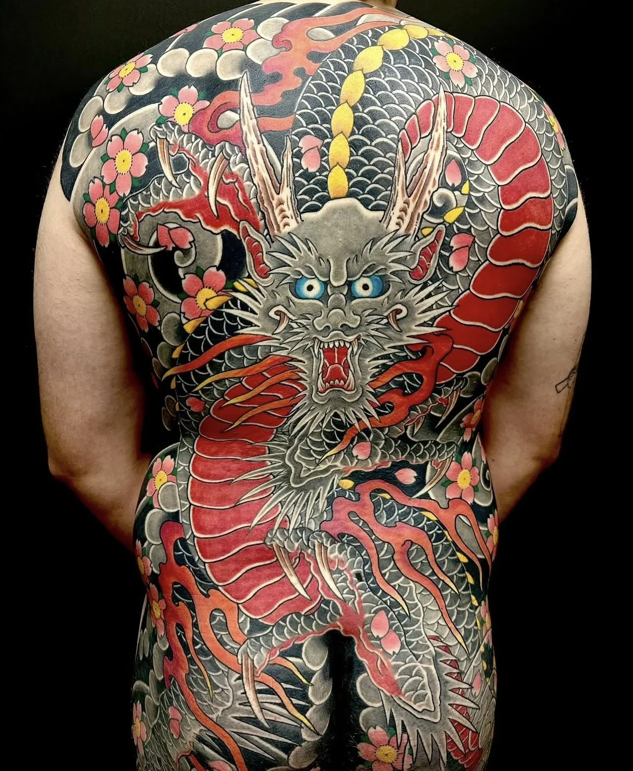 Often the best go to’s for coverups are Japanese flowers, Koi, Snakes, Dragons, Fu dogs, and so on. Creatures that can have a lot of black in them, organic shapes, and plenty of room for colour in the right areas. I really like to insert good amounts of colour in to any areas of the project that still have some free skin, to draw the eye away from the messier areas where the old tattoos are. Things that aren’t as good for coverups are human figures and faces, masks and so on as they rely on a lot of clear space where the skin should be,